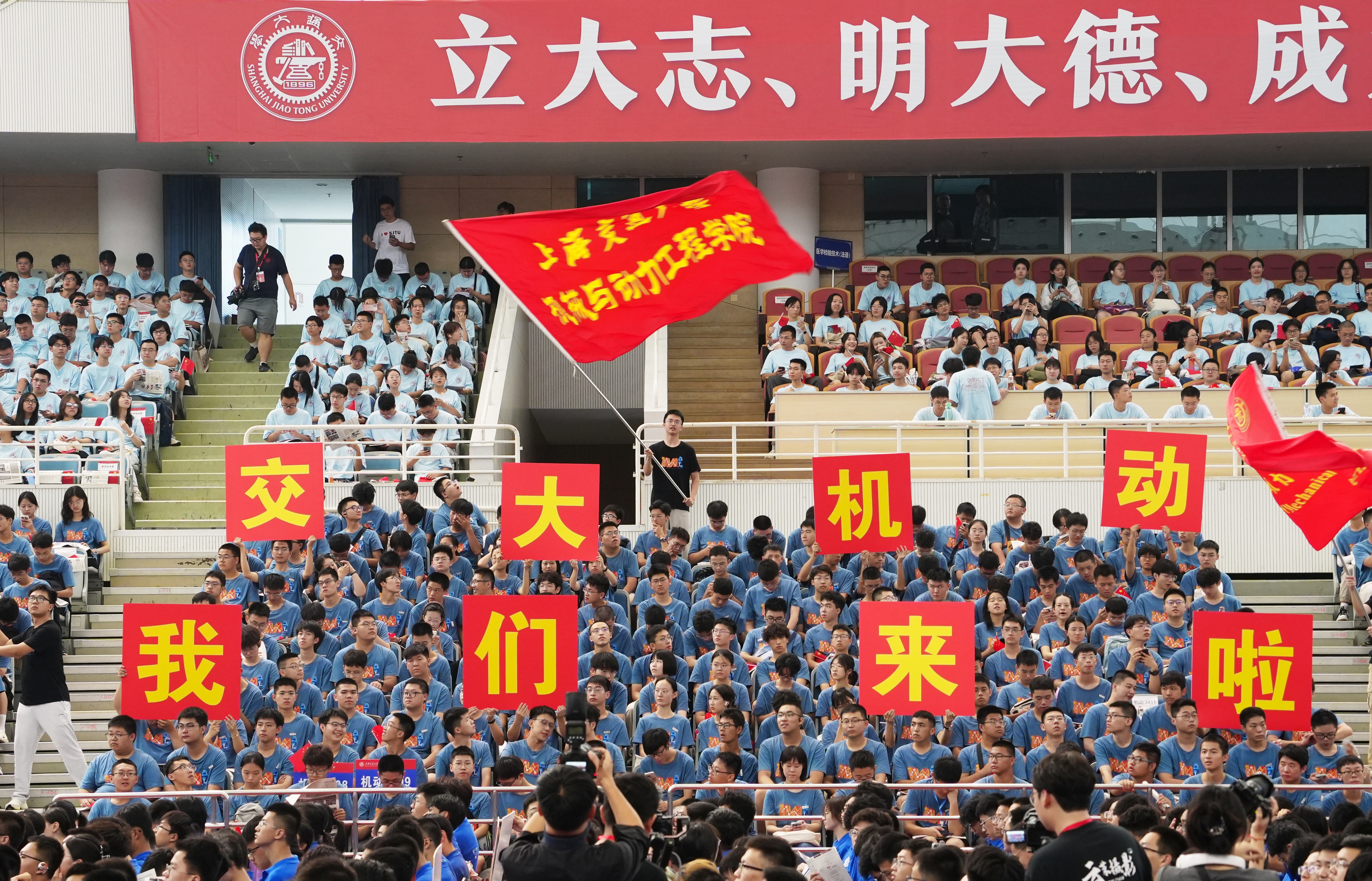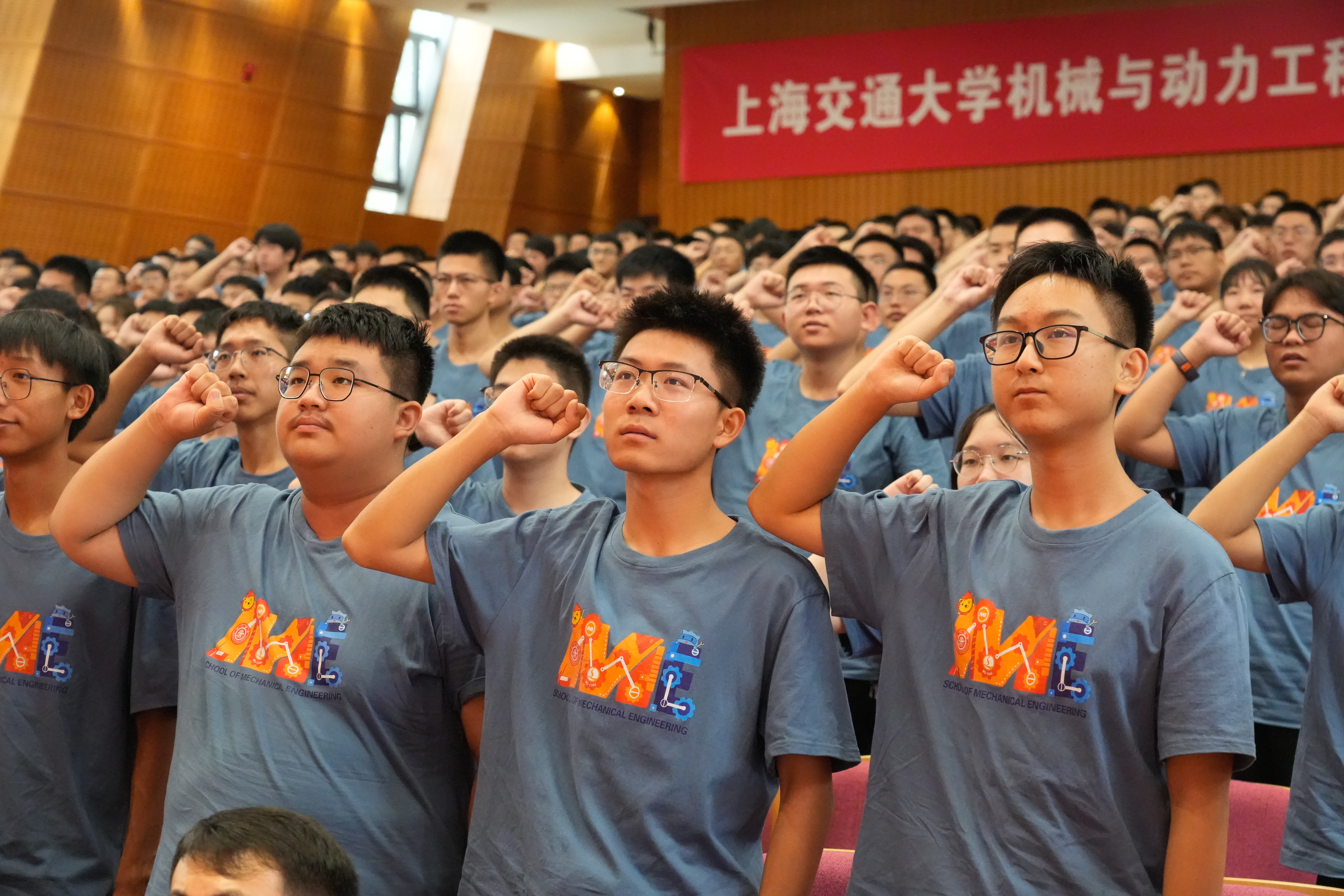 全体新生庄严宣誓:“我将谨记‘饮水思源,爱国荣校’之校训,传承百年机动精神,诚信为本、精勤为学、脚踏实地、追求卓越,树立学术理想,坚守行业情怀,为制造强国实业兴邦而奋斗终身!”