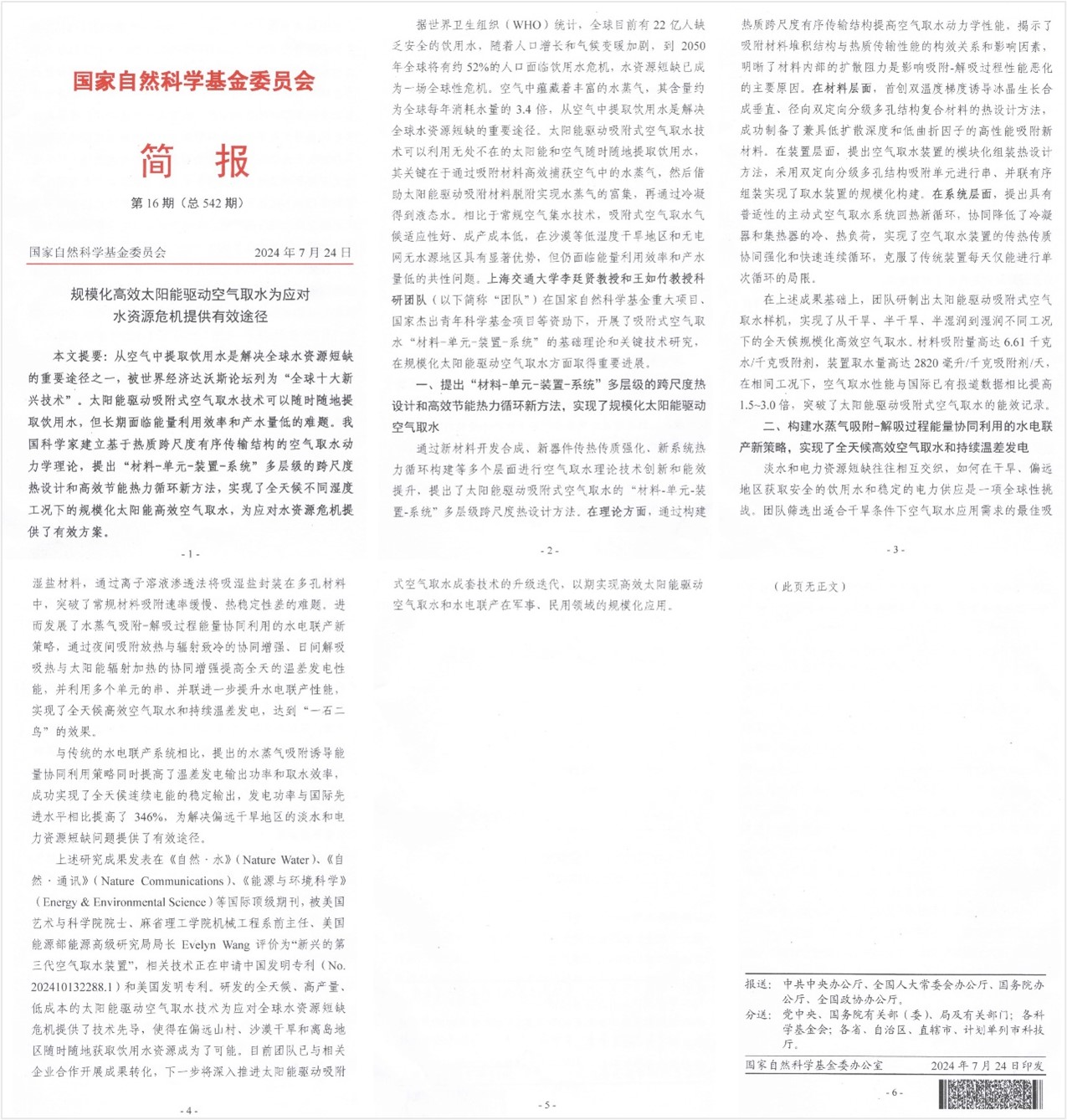 7月24日,《国家自然科学基金委员会简报》以“规模化高效太阳能驱动空气取水为应对水资源危机提供有效途径”为题,专题报道了beat365中文官方网站beat365中文官方网站李廷贤/王如竹团队在太阳能空气取水领域取得的重要成果。