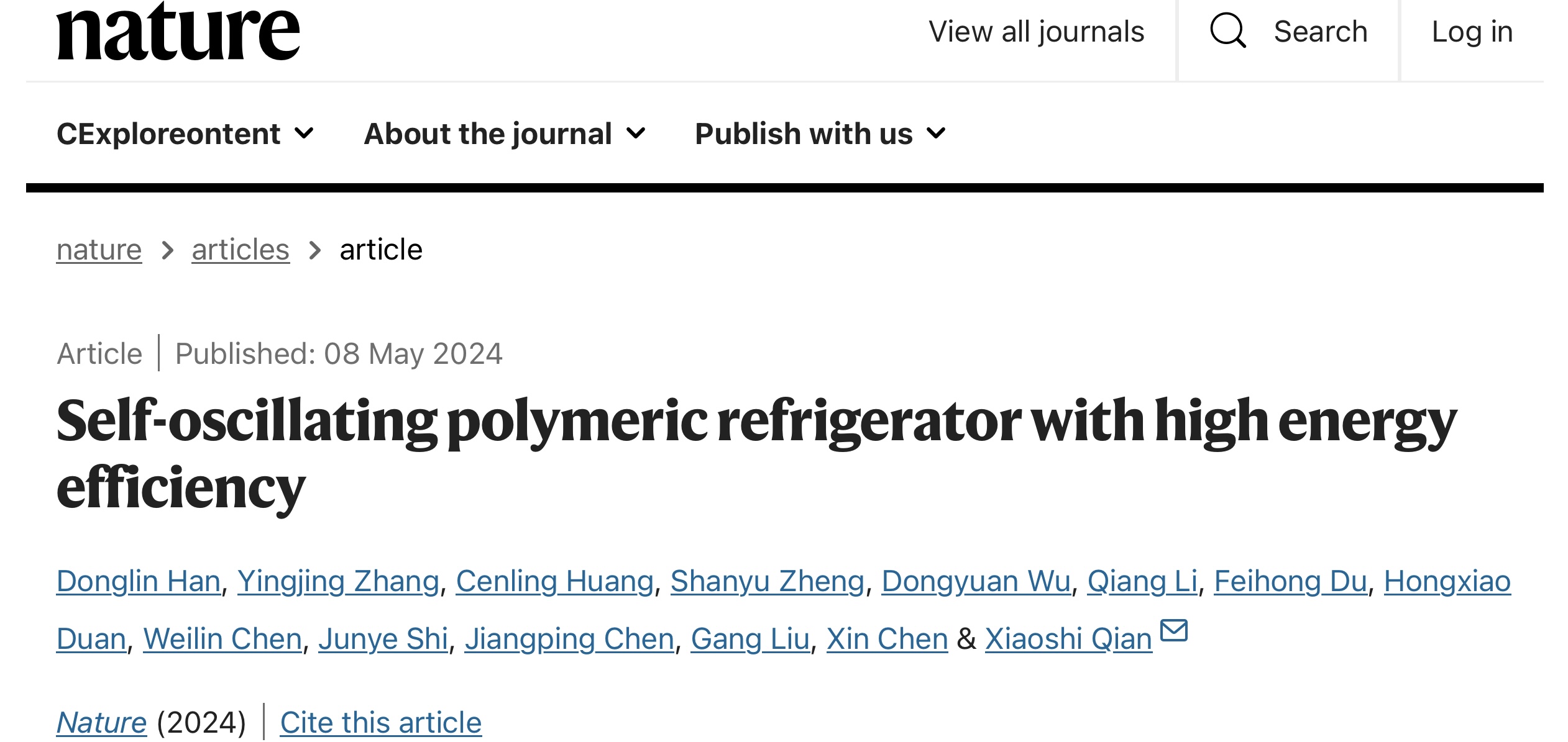 5月8日,beat365中文官方网站beat365中文官方网站前瞻交叉研究中心钱小石教授课题组在Nature上发表“Self-oscillating polymeric refrigerator with high energy efficiency”的论文。博士研究生韩东霖和硕士研究生张楹婧为共同第一作者,钱小石教授为论文通讯作者。钱小石教授加盟beat365中文官方网站6年来,相关研究工作已在Nature、Science发表6篇论文,其中以第一或通讯作者发表4篇。