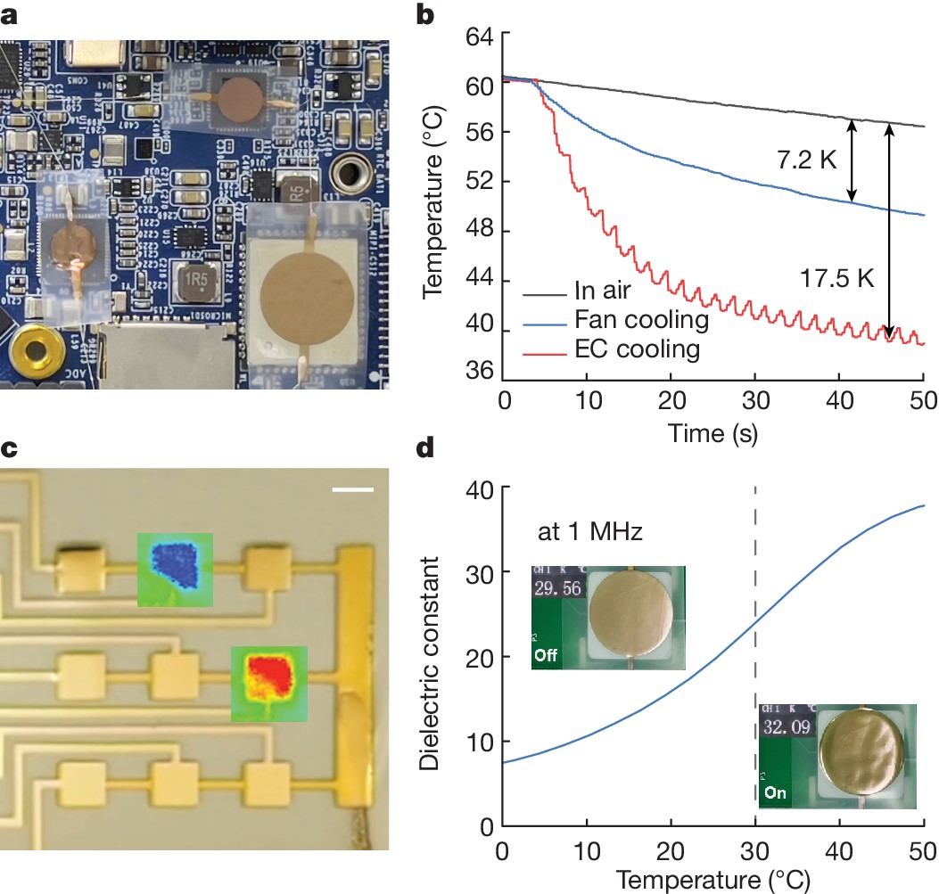 研究团队结合弛豫铁电高分子材料在电场作用下的电致熵变(电卡效应)和电致伸缩效应,设计与制造了“自驱动”的高分子制冷薄膜系统。该系统无需外加驱动装置,而是优化了高分子制冷工质本身的机电耦合效率,设计了电-机械形变与电卡制冷效应协同驱动的方法,实现了轻量化、高能效比、高精度和智能化的制冷效果。