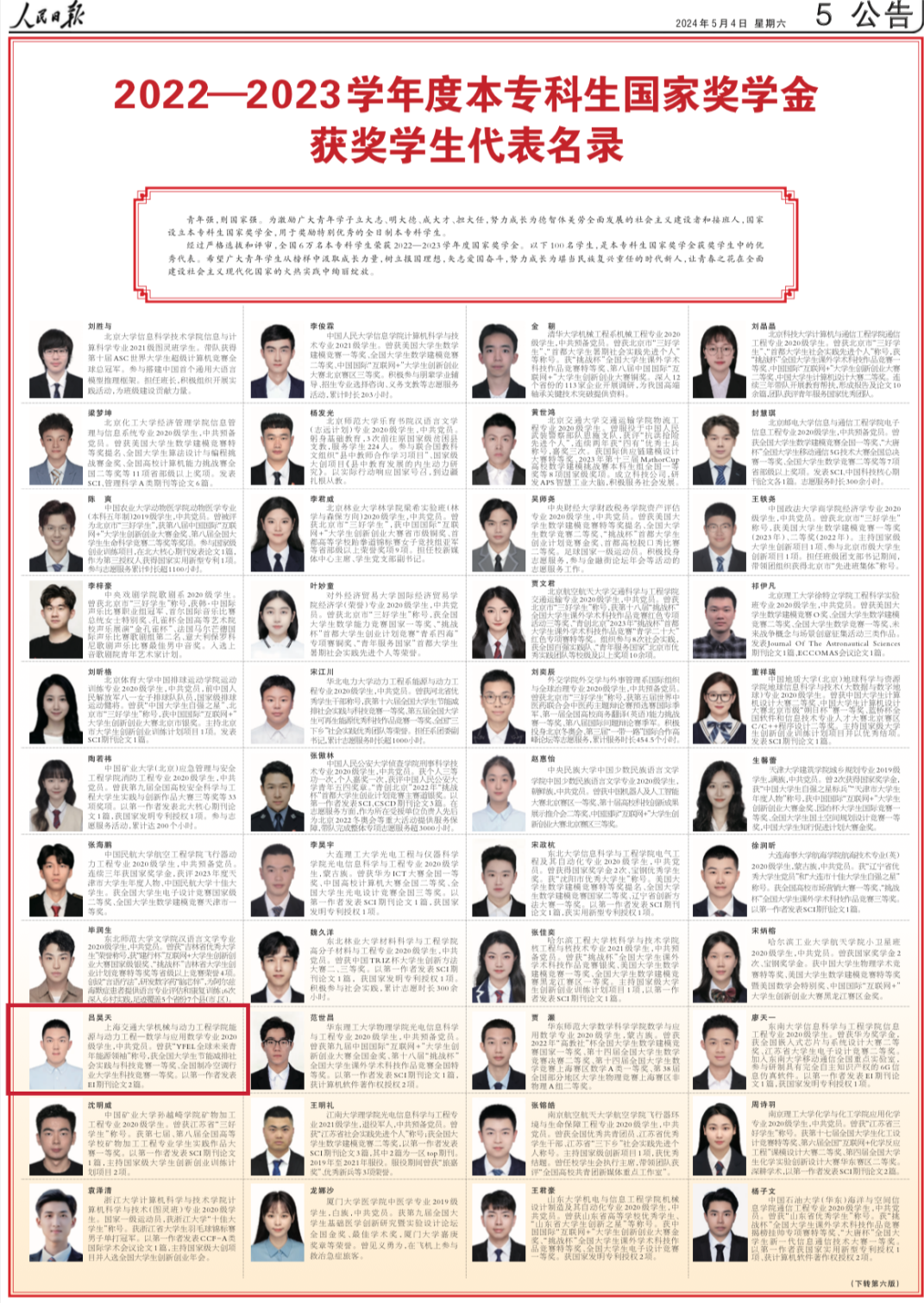 经过严格选拔和评审,全国4.5万名优秀研究生、6万名本专科学生荣获2022-2023学年度国家奖学金。近日,《人民日报》专版刊登了国家奖学金获奖学生代表名录,学院2020级学生吕昊天从十万余人中脱颖而出,成为国家奖学金获奖学生代表。