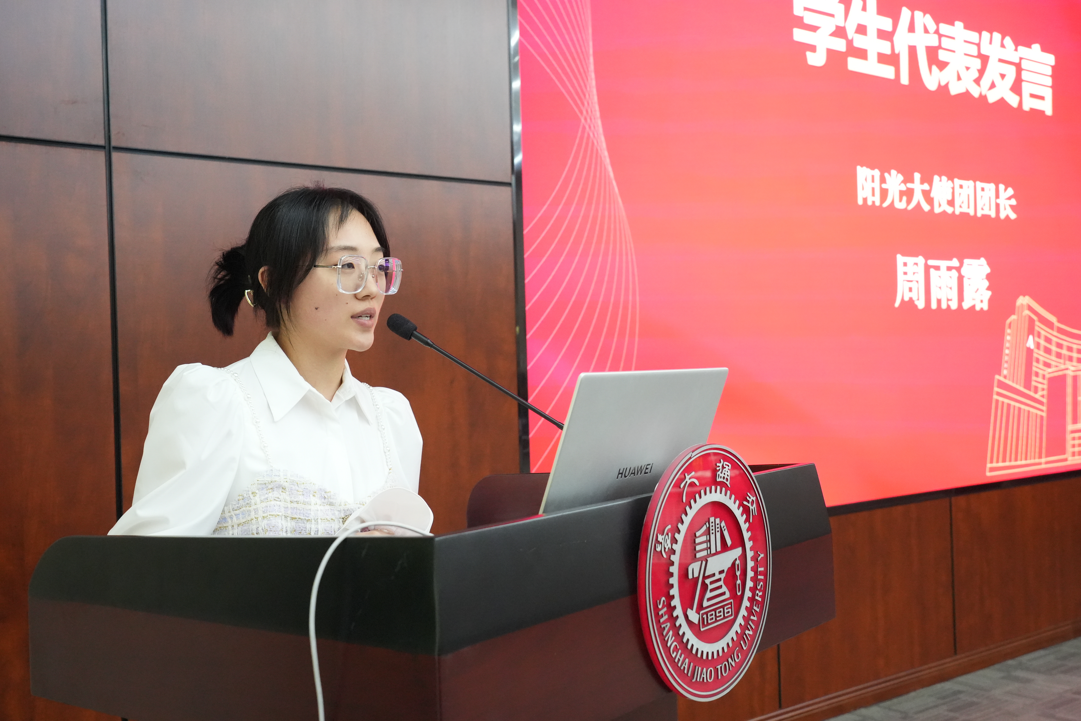 周雨露作为阳光大使团学生代表发言,表示将充分依托心理辅导站平台,更加专业、广泛地倾听学生们的心声,进一步发挥朋辈互助的力量。