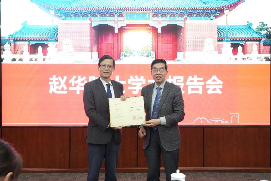赵华院士以“零碳内燃动力系统关键技术与未来趋势”为题作学术报告,围绕双碳目标,分析零碳动力系统的现状,并与现场师生进行了探讨和交流。黄震院士代表学校向赵华院士颁发顾问教授聘书。