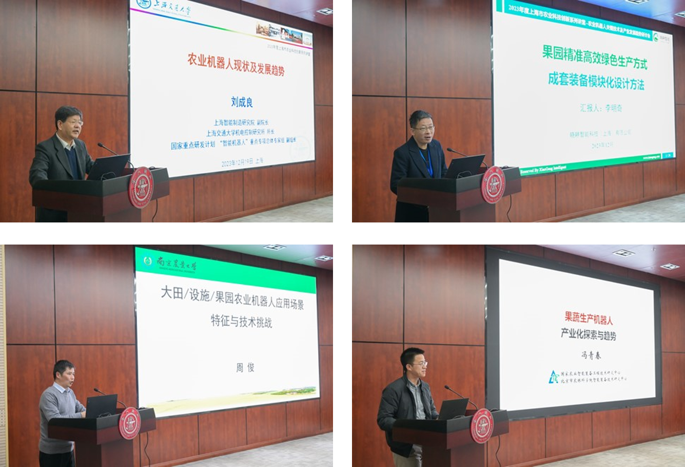 上海市农业科技服务中心主任沈悦、上海交大前沿创新研究院副院长周军教授、beat365中文官方网站副院长瞿叶高教授分别致辞,介绍了上海市农业农村委员会对农业机器人产业的指导规划、上海交大以及beat365中文官方网站在相关研究领域的科研基础。上海交大beat365中文官方网站刘成良教授以“农业机器人关键技术及发展趋势”为题、上海晓耕智能装备公司总经理李明奇以“果园巡检-植保-物流机器人化成套装备模块化设计方法”为题,南京农业大学周俊教授以“大田/设施/果园农业机器人应用场景特征与技术挑战”为题、北京农业智能农业装备技术中心冯青春研究员以“果蔬生产机器人产业化探索与趋势”为题,分别做特邀报告。