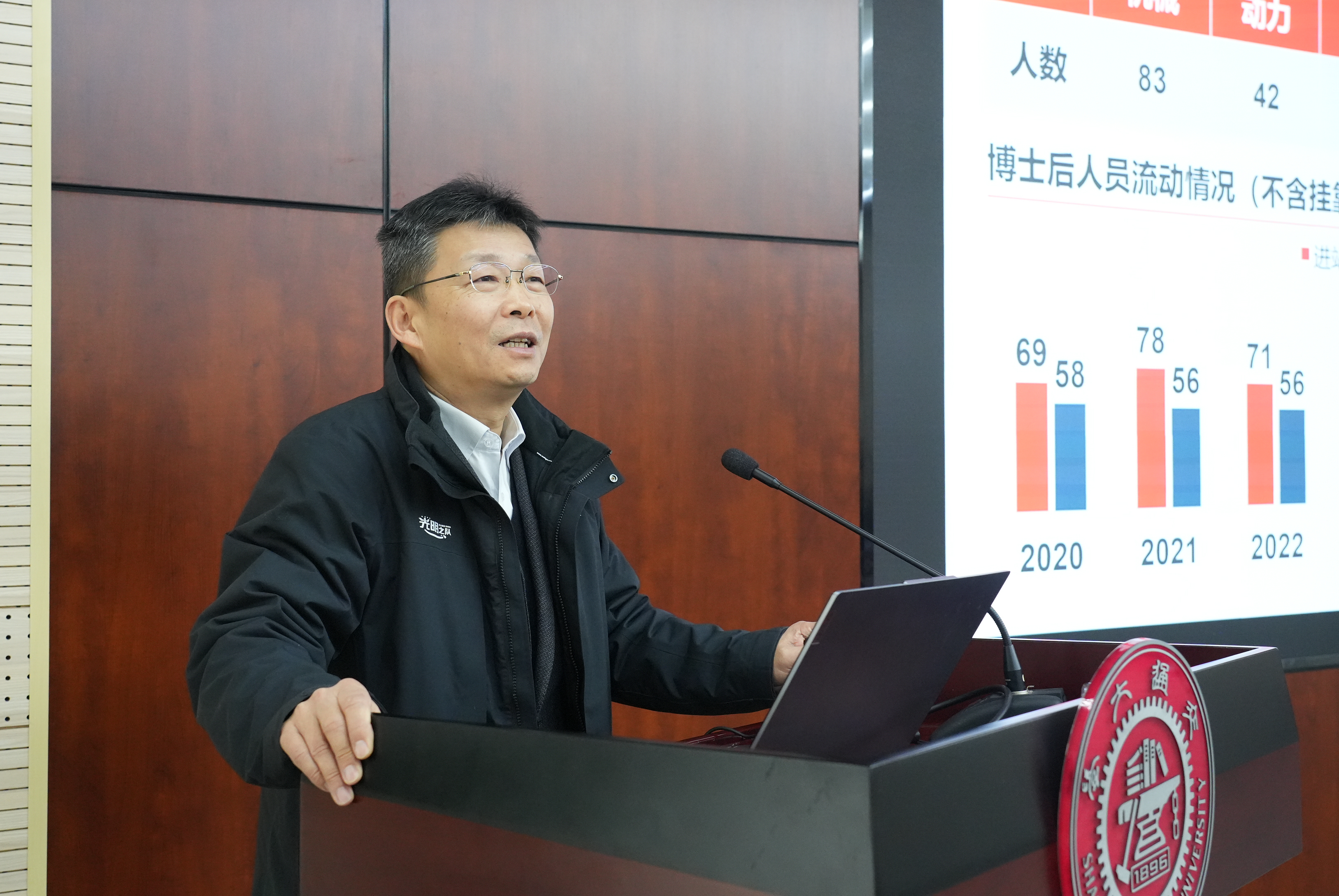 院长杜朝辉介绍了目前学院博士后队伍总体发展情况,梳理了近年来博士后各类基金、项目、计划的获资助情况,明确了学院对博士后的在站工作要求,并就博士后工作期限、因公出国(境)管理规定、年度考核等内容做了重点介绍,希望大家重视和把握基金、项目等的申请机会,积极参与科研训练和集体活动。