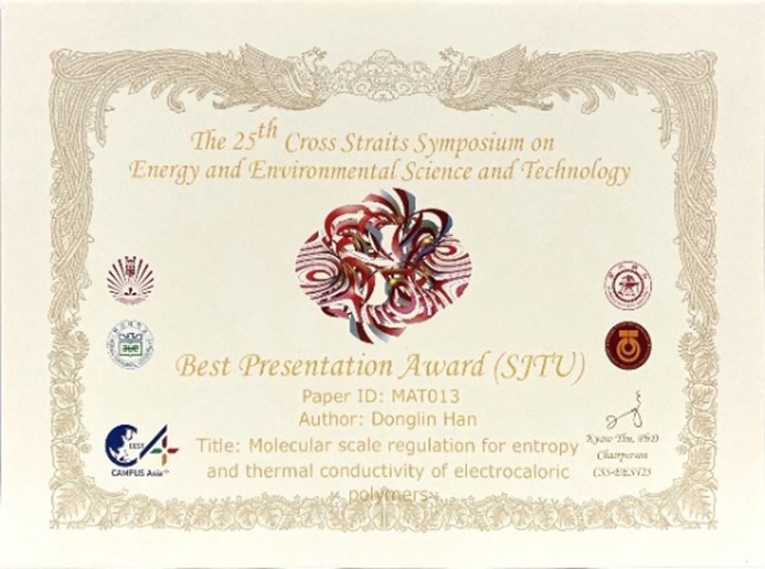 11月19-22日,第25届“亚洲校园”CSS国际学术会议在日本福冈举办。本届国际学术报告会由日本九州大学主办,beat365中文官方网站与韩国釜山国立大学、马来西亚理工大学联合举办,来自四所亚洲高校能源、环境、材料、化工领域的30多位教授和80余名研究生参加,beat365官网4名优秀博士生入选参加活动并分别进行了口头汇报。在会议闭幕式上,beat365官网博士生韩东霖论文Molecular scale regulationn for entropy and thermal conductivity of electrocaloric polymers获最佳论文奖,论文也获得推荐,将发表于EVERGREEN(Joint Journal of Novel Carbon Resource Sciences & Green Asia Strategy)期刊。