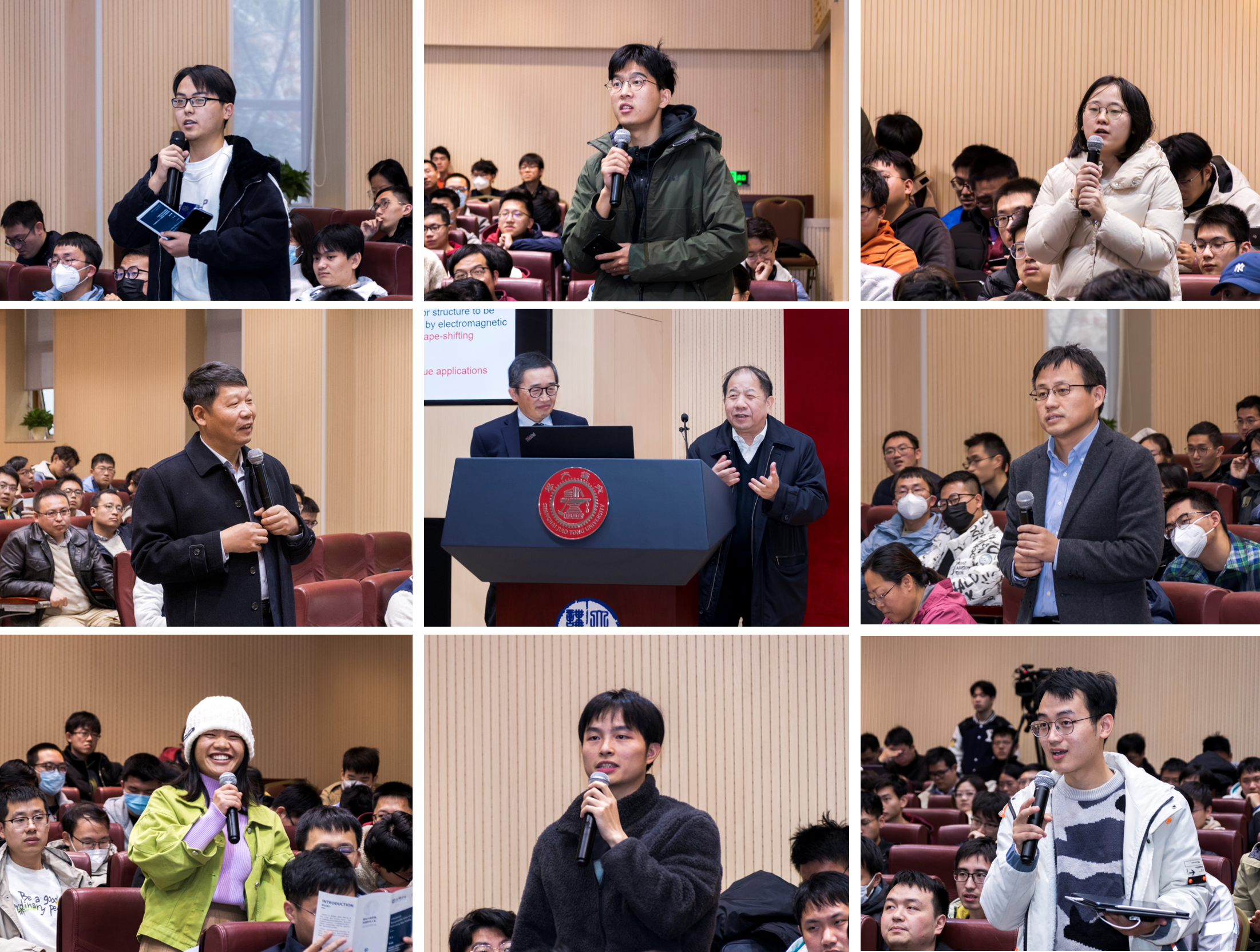 黄永刚院士从生物动态变形软材料系统引入,深入浅出地介绍了一种由分布式洛伦兹力驱动的可编程机械超表面,展示了响应时间在 0.1 秒以内的复杂动态变形功能,并建立数控驱动方案,实现了三维目标形状的高精度自进化逆向设计,最后介绍了动态变形软材料在实施原位立体成像和微型机器人设计和驱动策略等方面的应用前景,并与参会师生进行了互动交流。