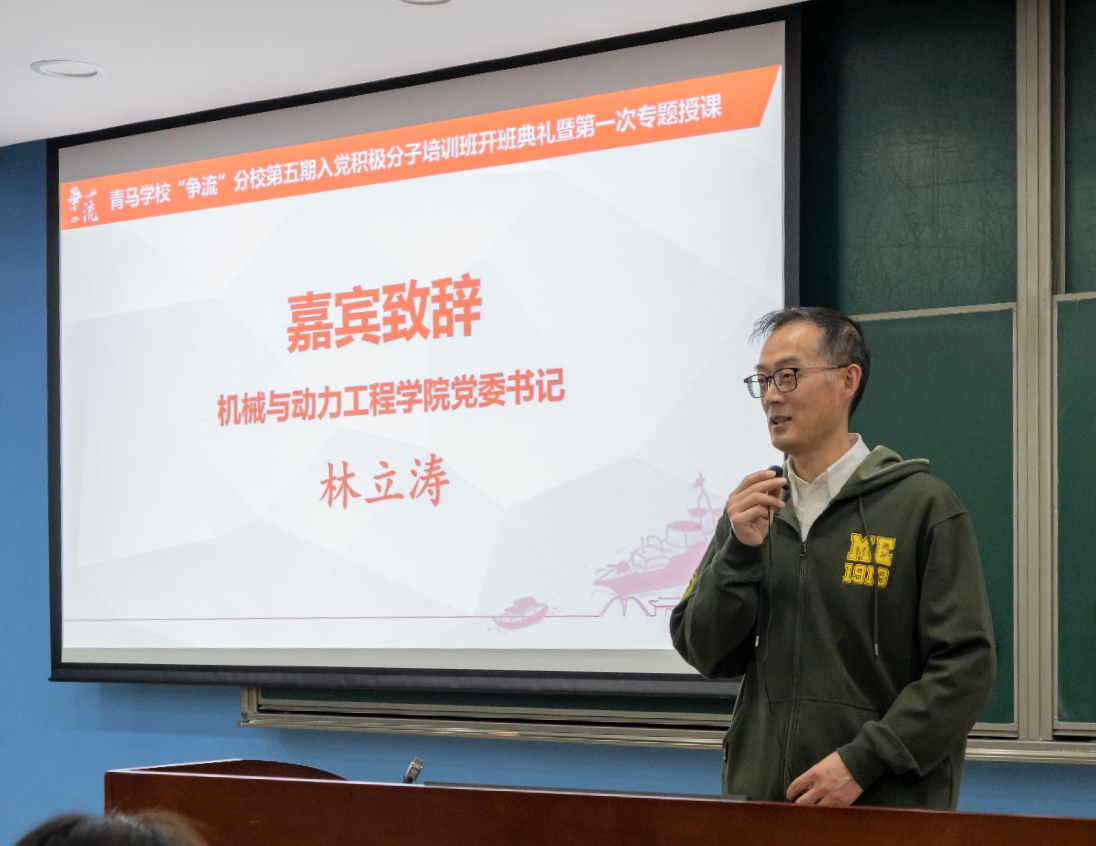 4月26日,由机械动力工程学院和中英国际低碳学院联合开办的青年马克思主义学校“争流”分校第五期入党积极分子培训班开班典礼举行,活动邀请beat365中文官方网站档案文博管理中心副主任、校史博物馆馆长欧七斤上专题党课。beat365中文官方网站党委书记林立涛,思政教师,辅导员及入党积极分子培训班全体学员参加了典礼。典礼由培训班副班主任李哲主持。
