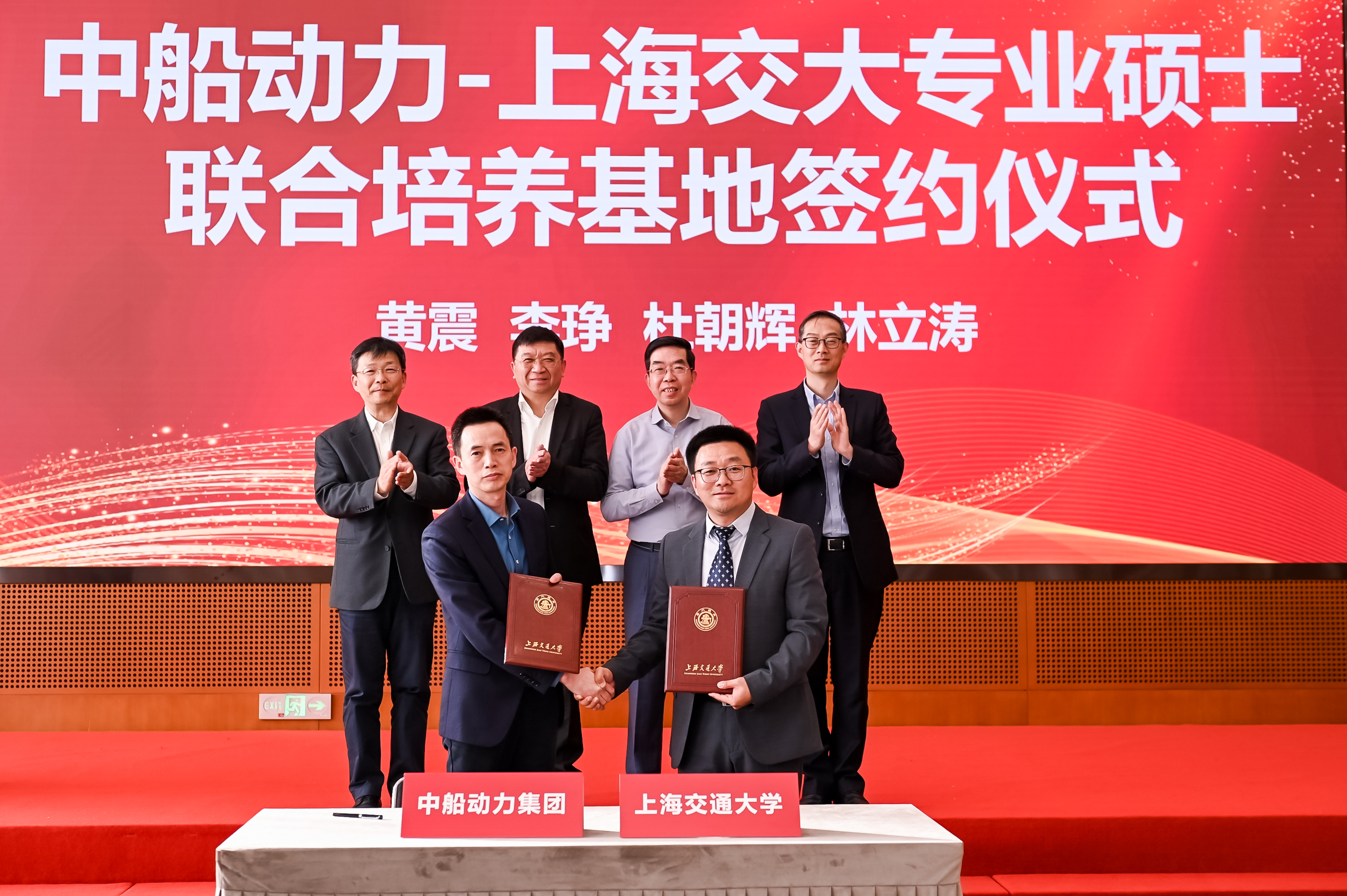 会上签约共建“中船动力-上海交大专业硕士联合培养基地”,吴朝晖首席科学家和朱磊分别代表中船动力集团和上海交大签约,黄震、李琤、杜朝辉和林立涛共同见证签约。