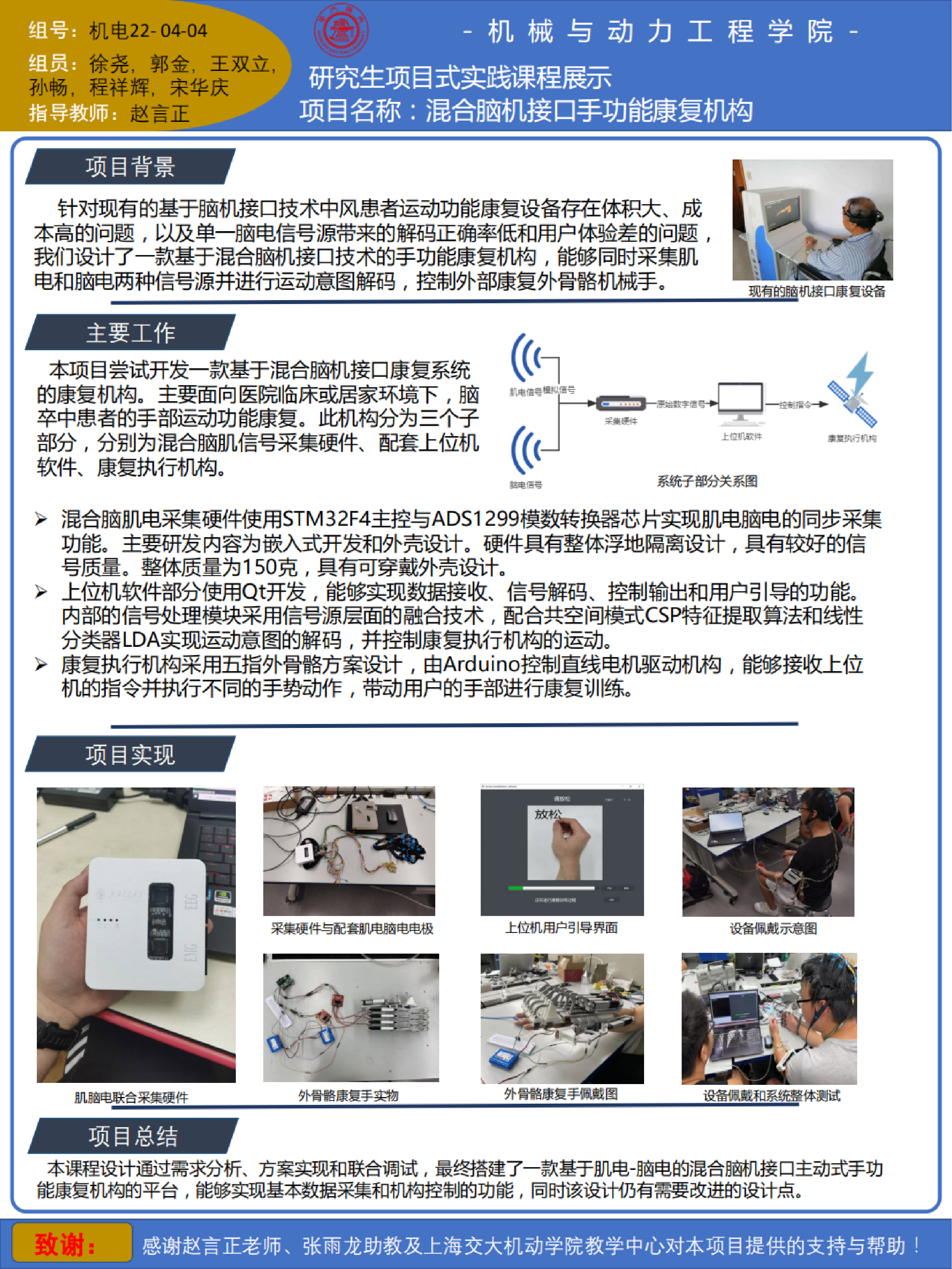 混合脑机接口手功能康复机构 | 徐尧,郭金,王双立,孙畅,程祥辉,宋华庆 | 赵言正 | |