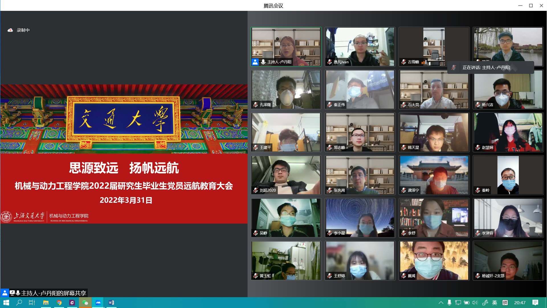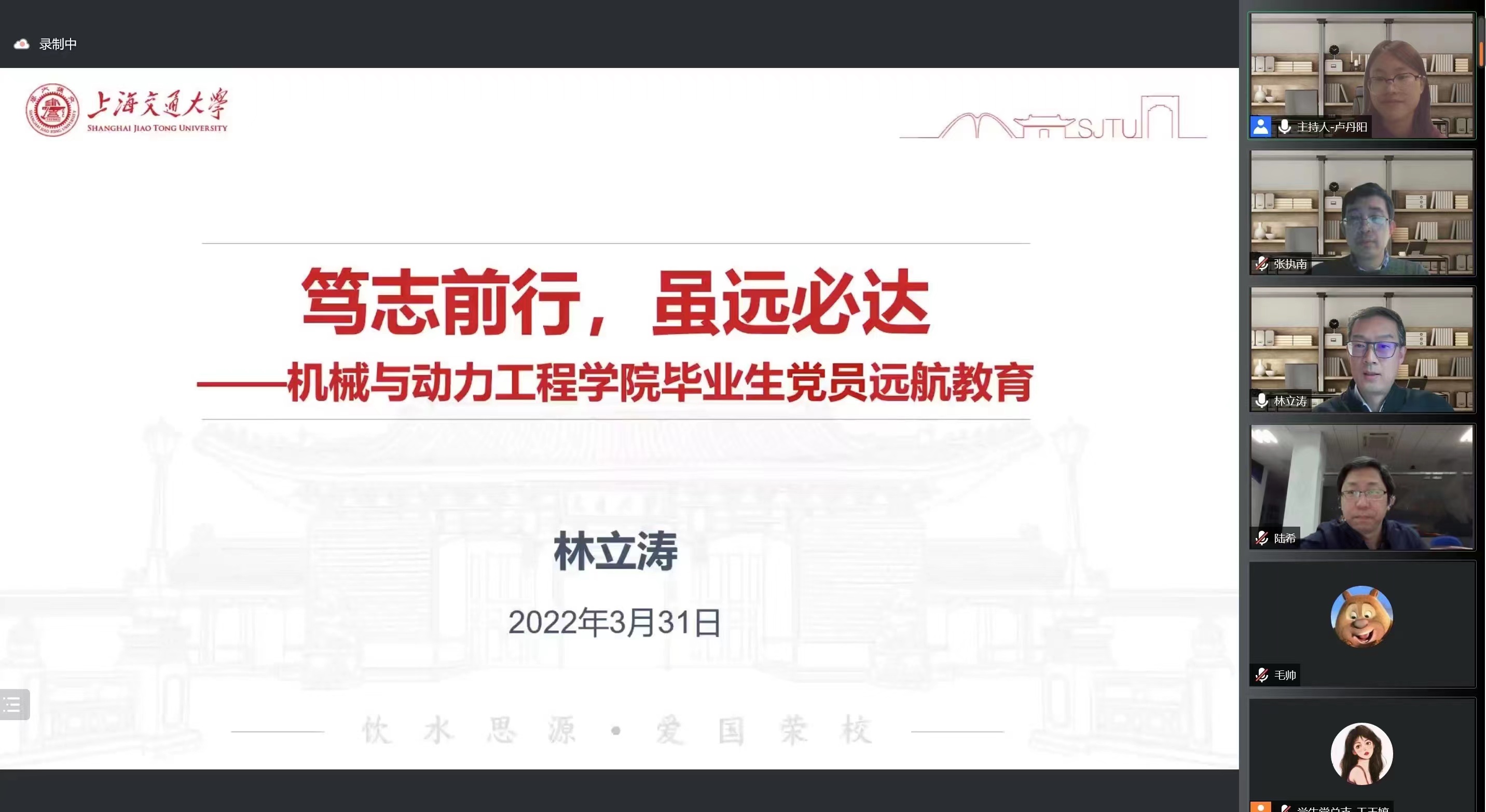 3月31日,beat365中文官方网站“思源致远,扬帆远航”2022届研究生毕业生党员远航教育大会在线举行。beat365中文官方网站党委书记林立涛,党委副书记张执南,2006级博士校友、上海卫星工程研究所深空探测与空间科学总体室主任、党支部书记陆希,学院思政教师、辅导员以及2022届研究生毕业生党员参加了会议。会议由学院研究生党建工作负责人卢丹阳主持。