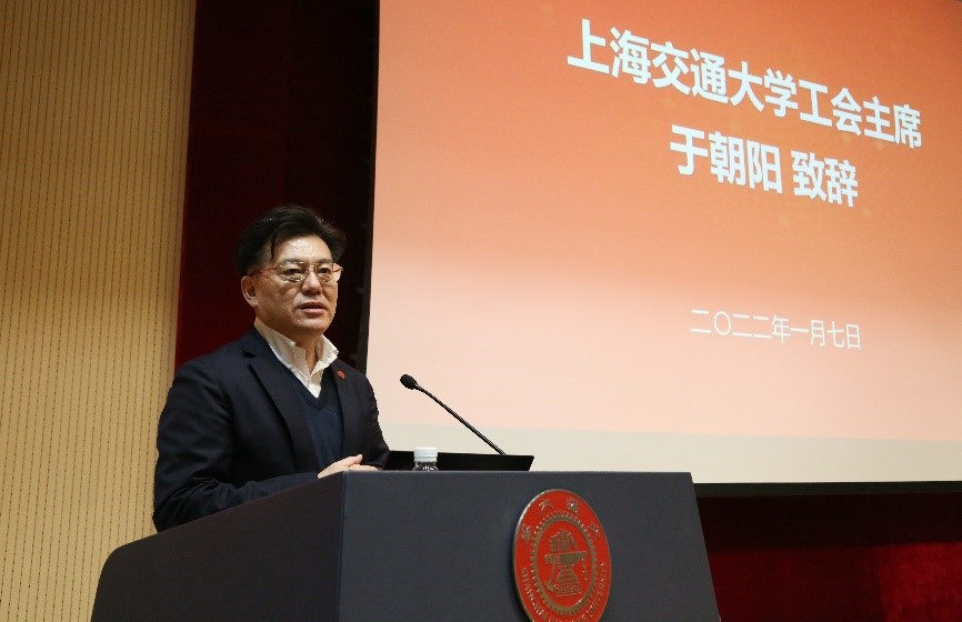 上海交大工会主席于朝阳到会祝贺,教代会是教职工行使民主权利的重要载体,是推进民主管理和民主监督的重要组织形式,他肯定了学院工会在思想引领,维护教职工合法权益中取得的成效,介绍了校工会在履行参与、维护、建设和教育职能方面的工作,希望学院发扬优良传统,发挥榜样引领作用,积极动员组织教职工建功立业、争当先进,增强教职工获得感和幸福感。