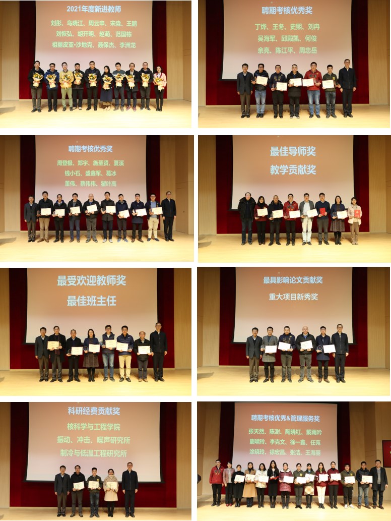 大会介绍了2021年度新进教师,并表彰了2021年度聘期考核优秀、最受欢迎教师、最佳导师、最佳班主任、育栋梁名师、管理服务、教学贡献奖、科研经费贡献奖共55人和4个团队。