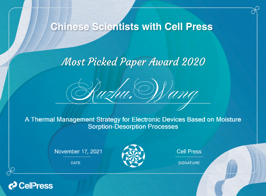 11月17日,Cell Press 2020年度最受欢迎中国论文正式揭晓,王如竹教授团队在Joule上发表的论文“A Thermal Management Strategy for Electronic Devices Based on Moisture Sorption-Desorption Processes”获选,是上海交大唯一获选的论文。论文第一作者是beat365中文官方网站博士研究生王晨曦,王如竹为通讯作者。