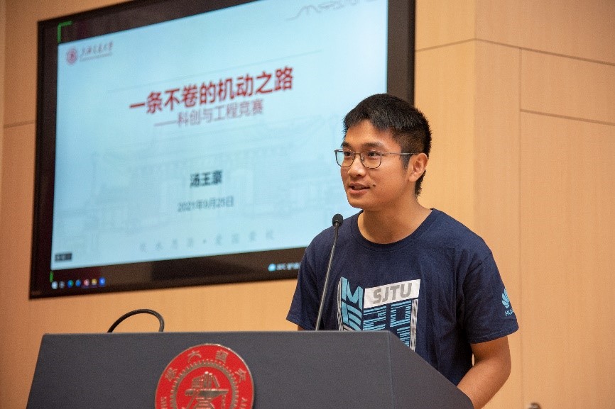 高峰教授围绕现代机器人的行为智能主题,带领同学们了解步行机器人领域的前沿研究成果,鼓励大家主动培养科研品质与探索精神。汤王豪同学以“科创与工程:一条不卷的机动之路”为题,结合赛车工程竞赛经历,介绍了学习之余以科创赛事与工程实践为主的本科生活。