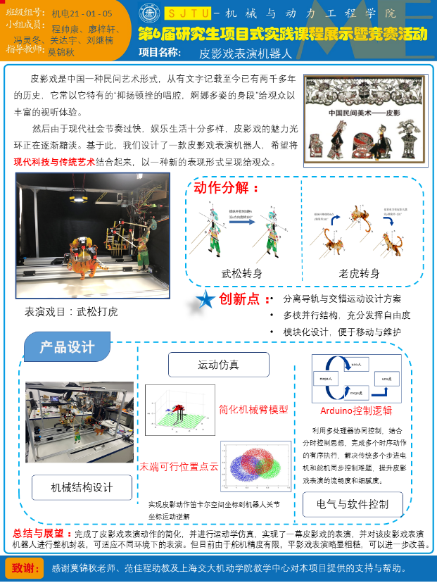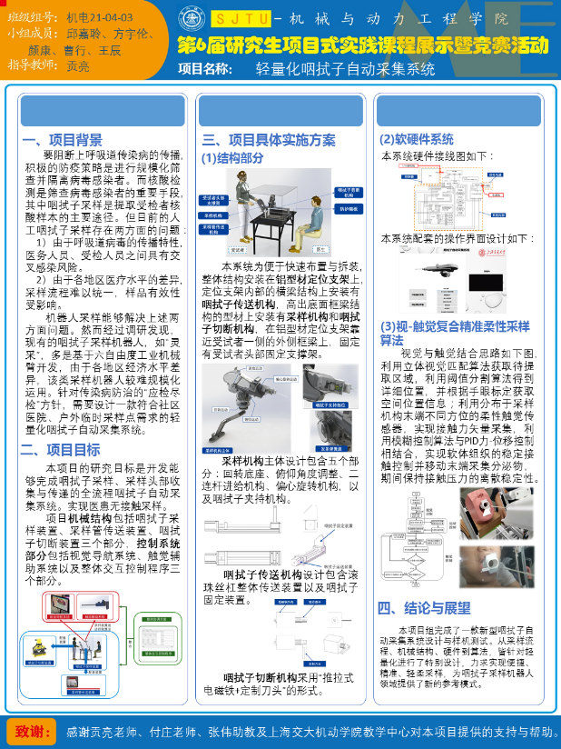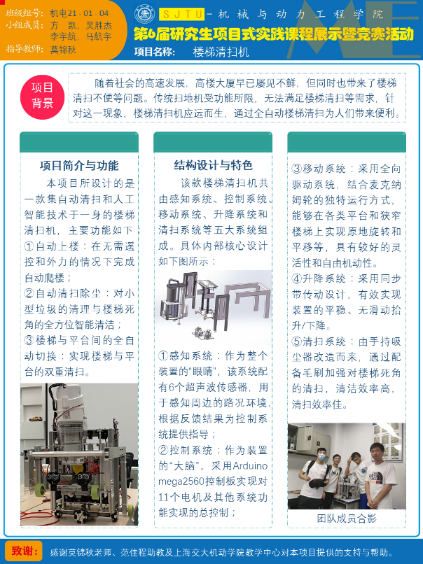 专业学位研究生项目式实践课程《复杂机电/动力系统的设计与实践》,自2013年设立至今,已形成了完善的教学大纲、实践平台和教学师资队伍,提高了学生的实践和创新创业能力,课程项目成果得到了社会和企业的认可。未来,项目式实践课程将深入挖掘和对接企业、市场需求,拓宽交叉学科项目设计,以创新竞赛等为牵引,搭建学生创新产品孵化器,培育富有创新力及应用价值的高水平作品,进一步提升专业学位研究生的综合工程实践能力。