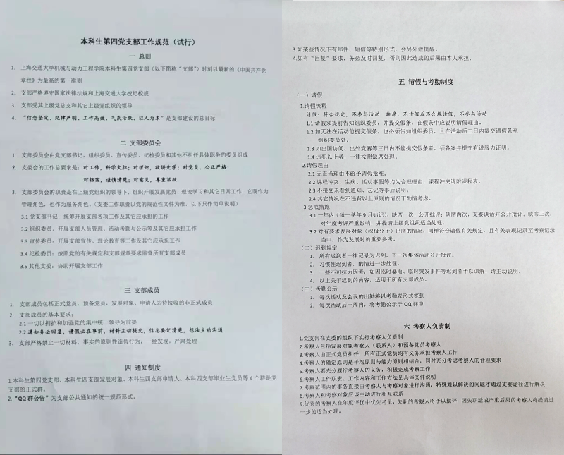 正式接手工作,我把自己在宿舍关了一周,一份一份阅读、整理党支部的材料,把线索和问题都理出来,做了一份发展党员和预备党员的工作指南,把成员管理、请假迟到等问题拎出来起草了一份工作规范,并和支委一起确定了“信念坚定,纪律严明,工作高效,气氛活跃,以人为本”的总目标。