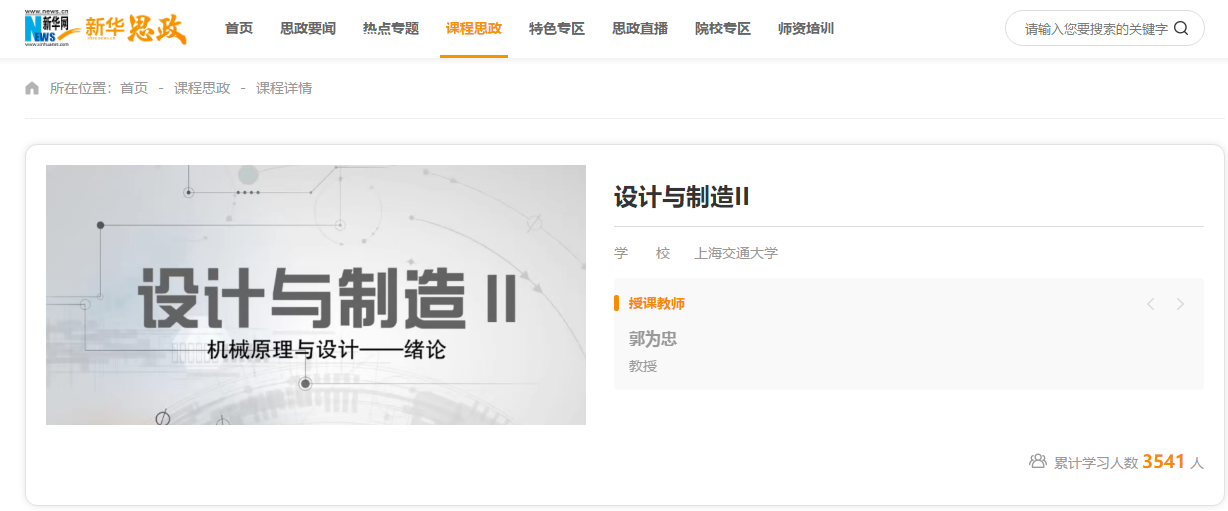 近日,beat365官网郭为忠教授主讲的《设计与制造II》课程思政教学资源在新华网展播,向全社会开放共享,学习人数已3500余人。