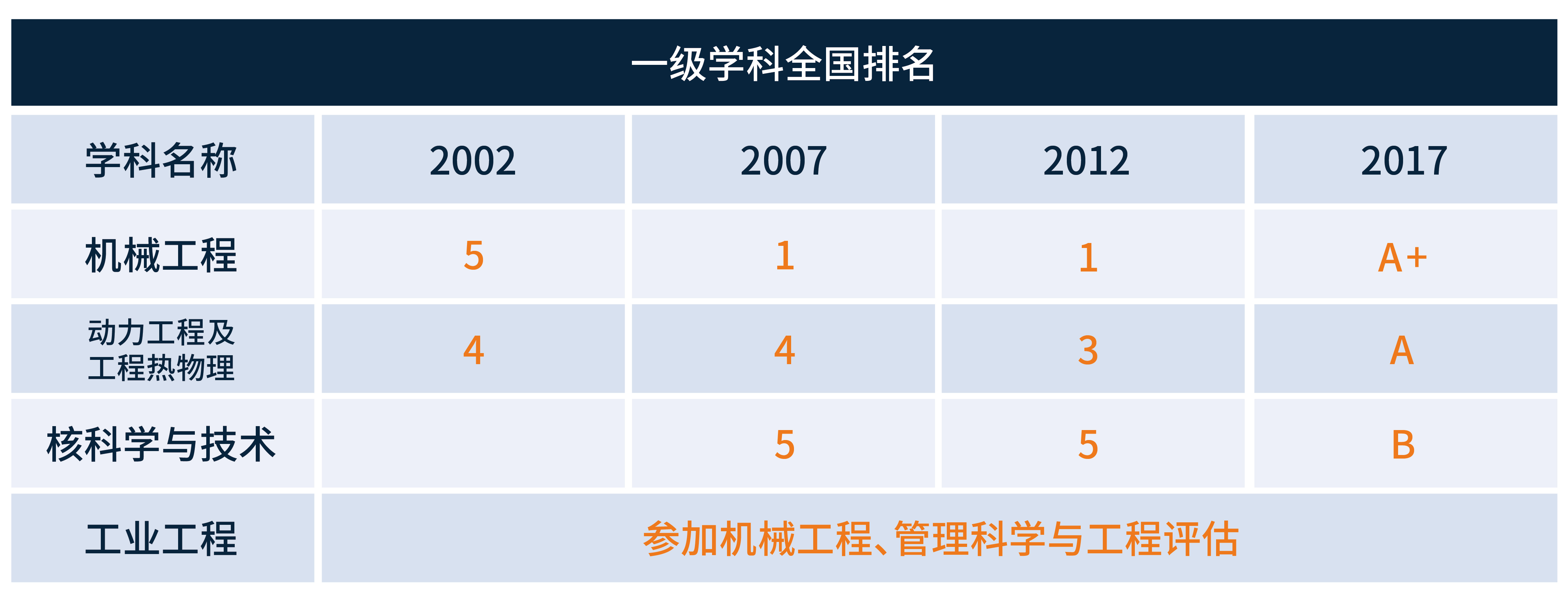beat365中文官方网站拥有机械工程、动力工程及工程热物理、核科学与技术三个一级学科,学科建设整体处于国内领先地位。在教育部的全国一级学科评估中,机械工程学科连续三次位居全国一级学科评估之首,动力工程及工程热物理学科位列A档。