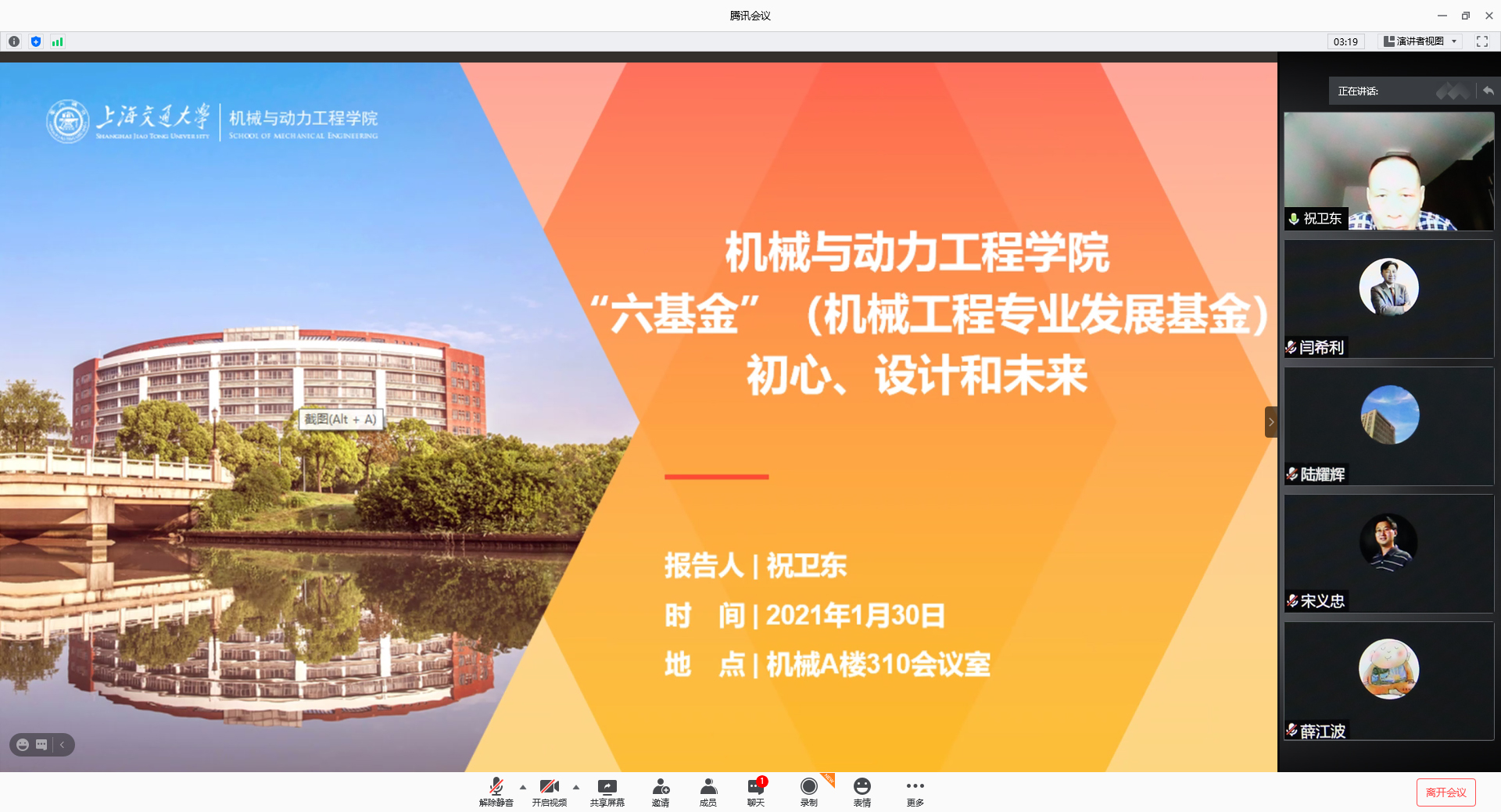 祝卫东通过云端介绍了基金的初心、设计和未来发展,表示“六基金”为关心机械工程学科发展、心系母校的校友们搭建互助交流的平台,期盼更多的校友参与“六基金”,共同为机械工程专业的发展贡献力量。