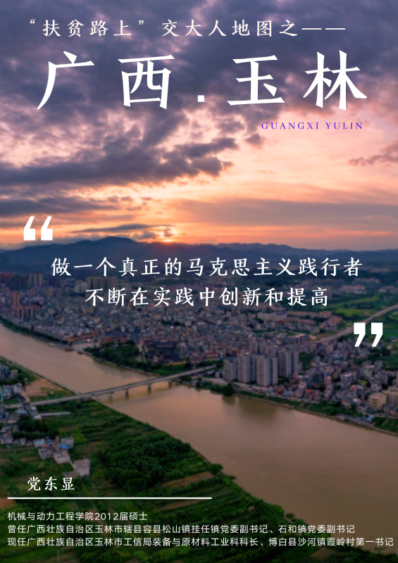 2011年11月,广西党委组织部来到交大召开定向选调生宣讲会,向大家发出呼吁:“到西部去,到基层去,到祖国和人民最需要的地方去建功立业。”这正是党东显多年的梦想,怀揣满腔热血和反哺家乡的情感,党东显和其他6位同样满怀梦想与抱负的同学一起走上了选调生之路。