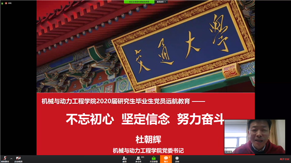 杜朝辉以“不忘初心,坚定信念,努力奋斗”为主题,为毕业生上了一堂生动的党课。他以医护工作者在一线抗击疫情、师生开展在线教学以及学生党员担任疫情防控志愿者等事迹,阐释了交大担当,进而解读了中国共产党人的初心和使命。杜朝辉带领党员重温“四讲四有”、“四个合格”以及党章中的八项义务,提醒党员在党言党,提高党员意识,做合格党员。他讲述了人民科学家钱学森学长最激动的两件事、林忠钦校长等一大批教师努力工作为学校争得的荣誉、以及易培云副教授的成长励志故事等,激励同学们志存高远,踏实工作,立足专业,大有作为,并希望大家牢记“饮水思源,爱国荣校”的校训,在各自的岗位上不断努力,为行业和国家发展做出新的贡献。