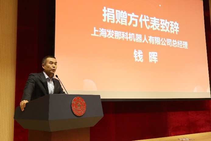 上海发那科机器人有限公司总经理钱晖代表设奖方致辞。他讲述了公司和学院的合作渊源,肯定了学院学子的综合素质和精神风貌,希望奖学金激励优秀学子勤奋学习、努力进取。