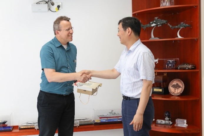 杜朝辉对Eckhard Groll的到访表示欢迎,并回顾了双方的历史合作情况。王皓就双博士联培项目与Eckhard Groll进行了深入讨论。王丽伟围绕学生交换项目中课程匹配与学分转换遇到的难题,与Eckhard Groll探讨了可能的解决措施。