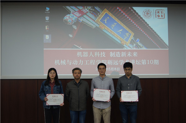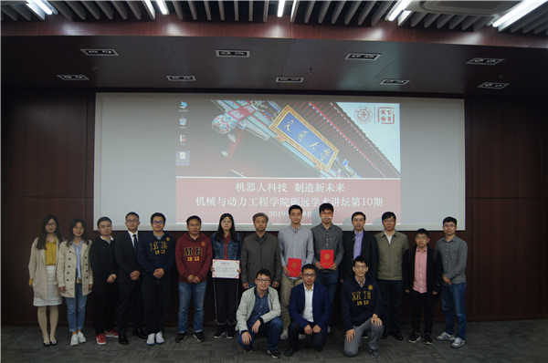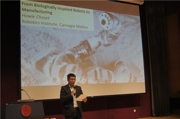 5月8日,beat365中文官方网站举办第十期砺远学术讲坛。本期讲坛以“机器人科技,制造新未来”为主题,卡耐基梅隆大学仿生机器人研究所Howie Choset教授,学院机器人研究所陈飞飞博士受邀作主题报告。上海宾通智能科技Jack Brice、龚超慧、任中强、吴征杰、董跃等出席了活动,报告吸引了近160名学生到场学习。活动由学院副院长熊振华主持。