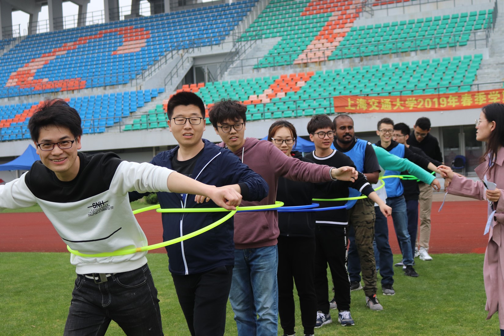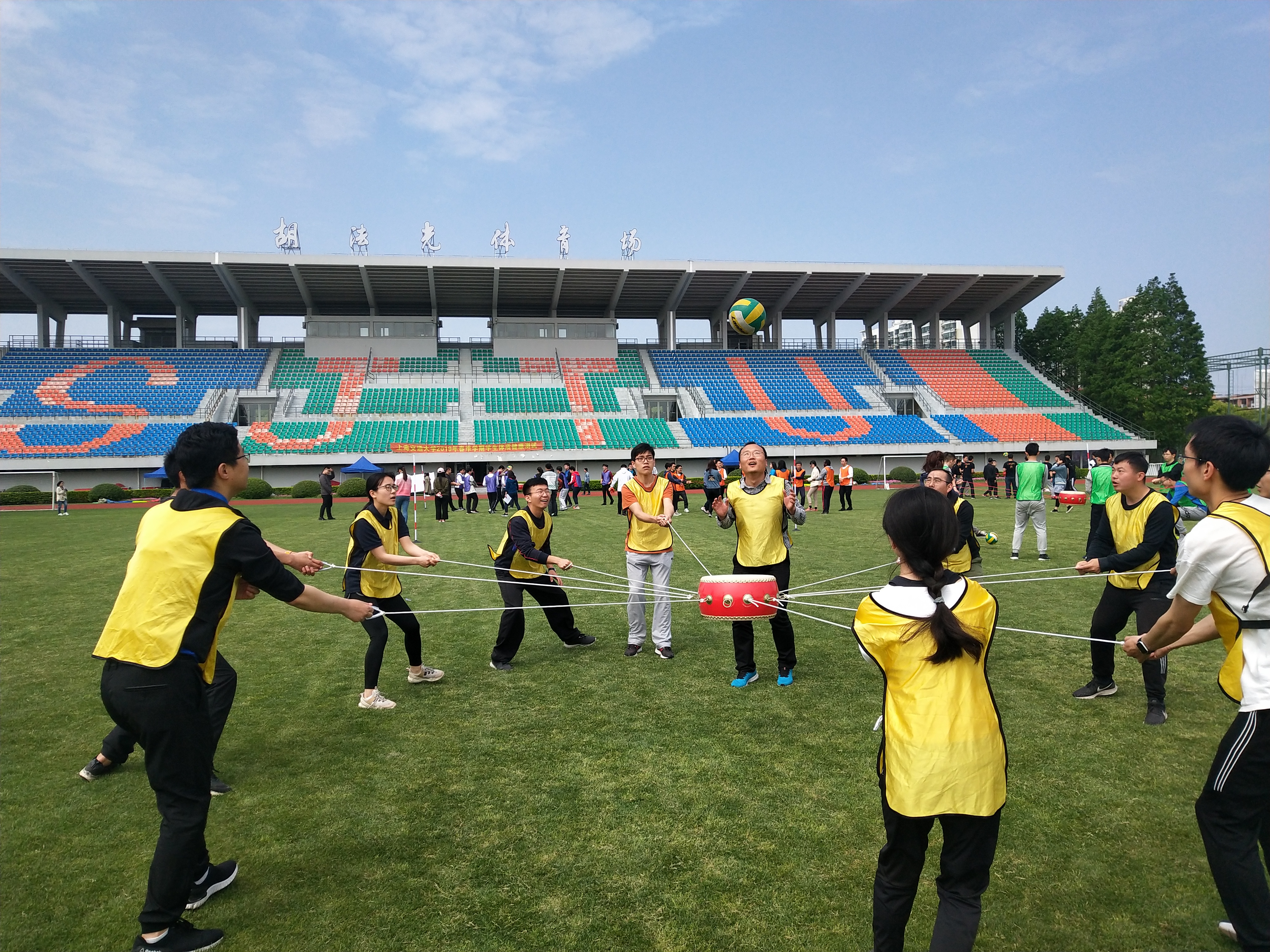 绿茵场上,师生们在同心鼓、袋鼠跳、连连看、巨人脚步等趣味项目中,全心投入、通力合作,总结技巧、找到节奏,相互鼓励、共同进步。