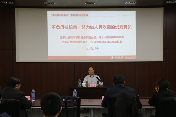 1969届校友、国家发展和改革委员会原副主任、第十一届全国政协常委、中国设备管理协会会长王金祥做客“杰出校友回母校”系列活动,带来“不负母校培育,努力做人民欢迎的优秀党员”的主题党课,校关工委副主任陶燕敏,学院常务副院长彭志科、党委副书记顾希垚以及90余名在校生党员、积极分子等参加了党课。