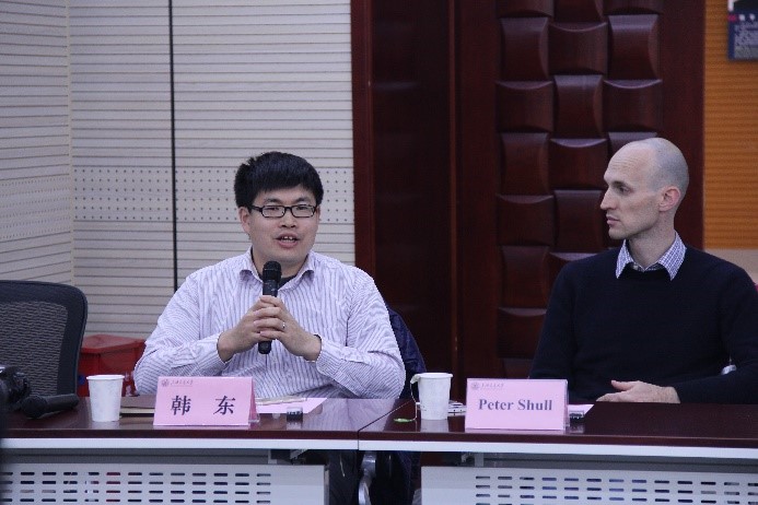 青年教师Peter B. Shull和韩东作为留学生会指导老师发言。Peter表示,在交大五年来,学院留学生的数量与日俱增,院留学生会的成立为学院学子和国际留学生提供了交流平台,希望留学生会发挥出推动学院国际化发展的作用。韩东结合自己在美国求学的经历,表示留学生会为异国他乡学子提供温暖港湾。