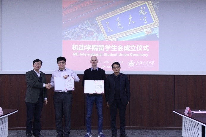成立仪式上,彭志科和王皓为Peter B.Shull和韩东颁发了聘书,聘请其担任留学生会的指导教师。顾希垚为留学生会首届主席团成员颁发聘书。