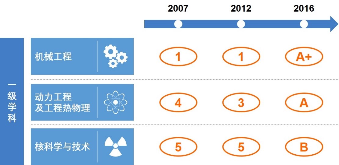 教育部学位与研究生教育发展中心日前公布了全国第四轮学科评估排名结果,beat365官网机械工程学科位列A+(前2%),动力工程及工程热物理学科进入A档(前2-5%),核科学与技术学科位列B档(前20-30%)。这是机械工程学科继2007年、2012年两次评估排名第一之后,再次领跑国内学科。