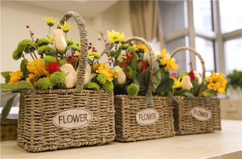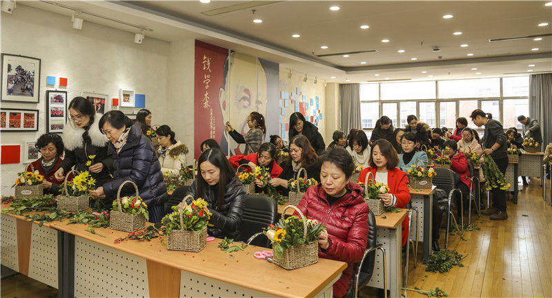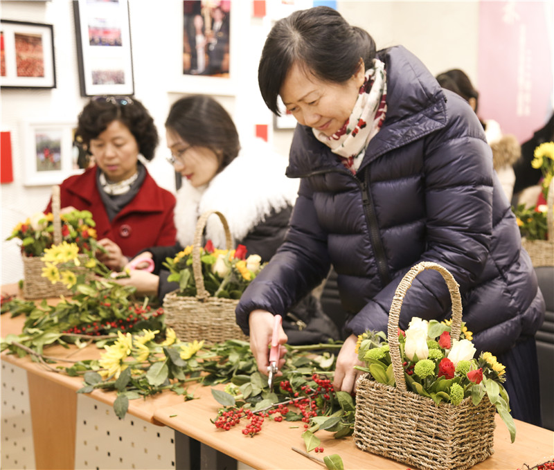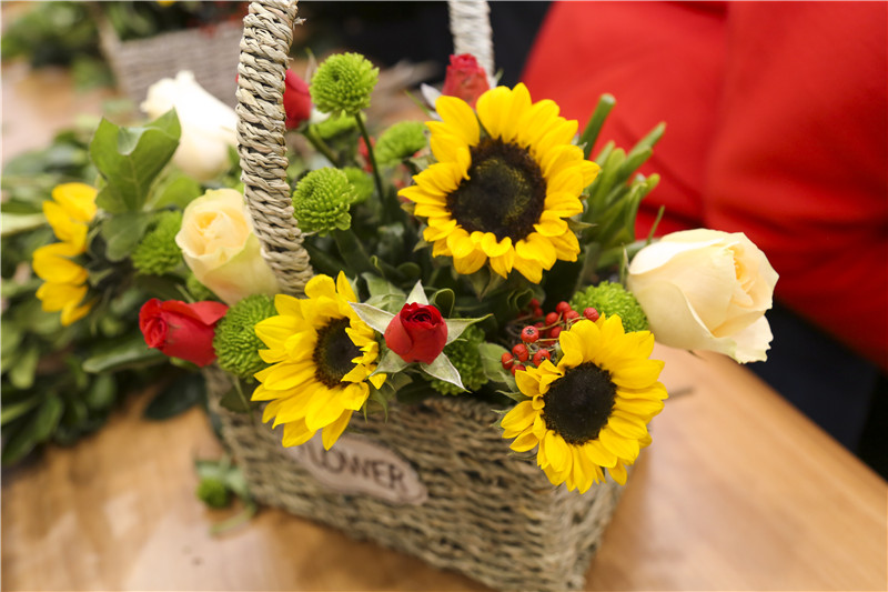 大家置身花的海洋,化身心灵手巧的花匠艺人,在园艺师的指导下,将杂乱无序的花枝变成了美丽花篮。