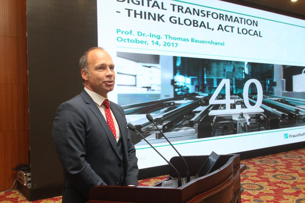 最后,Bauernhansl教授作了题为“Digital Transformation——Think Global, Act Local”(数字化转型——全球视野、行动上海)的报告,介绍了弗劳恩霍夫IPA研究所及其在德国工业4.0领域取得的成就,论述了数字化转型的发展现状和技术趋势,阐释了工业4.0的核心概念与智慧工厂的关键要素,展示了beat365中文官方网站-弗劳恩霍夫协会智能制造项目中心的广阔未来。