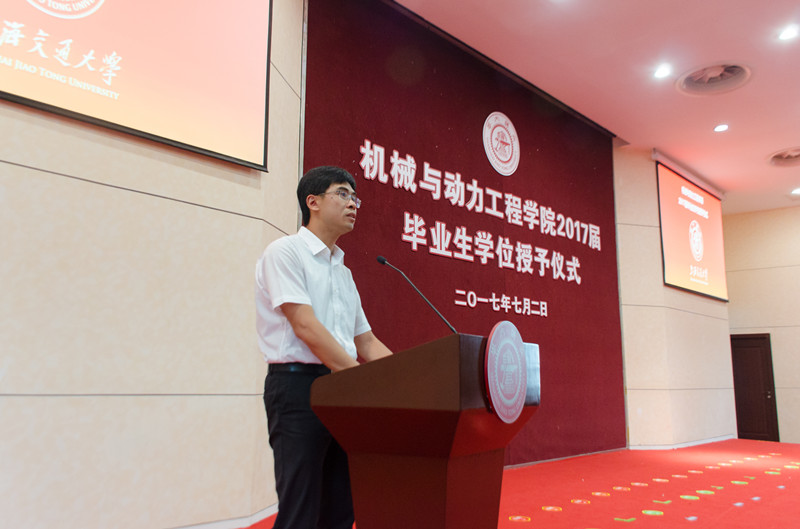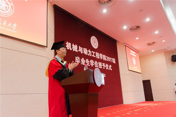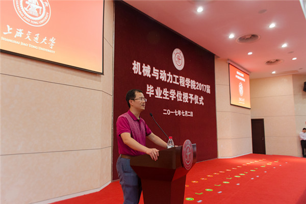 杜朝辉代表学院向2017届毕业生送上临别寄语。他表示,2017届毕业生处在学校历史交界点,承载了特殊使命,承接百年机动的优秀传统同时开创学院崭新未来。他欣慰地见证了毕业生们的点滴成长,从为科研不懈追求的首届钱学森班学生,到心怀求善之心的志愿者,以及领时代之风的创新创业者,2017届学子展示着自己的独特风采。最后,他用唐文治老校长的话对即将走入更广阔天地的毕业生们提出三点希望:“为第一等学问”,作为新时期的交大人,希望同学们不忘“学在交大”的踏实作风,脚踏实地,严谨为学;“成第一等事业”,希望同学们肩负责任、心怀使命,立大志有远见,讲信仰有担当,与民族共命运,与时代共发展;“砥砺第一等品行”,希望同学们在今后的道路上处变不惊,心怀接纳得失的气度,不为世俗洪流所妥协。他相信毕业生们定能牢记校训,传承精神,实现理想。
