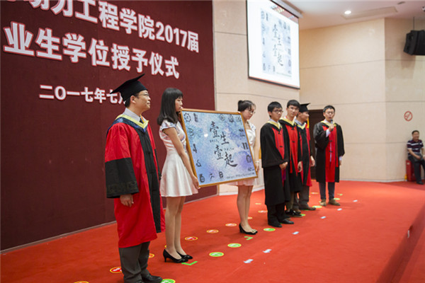 全体毕业生为学院献上了一份特殊的礼物——由四百多名毕业生的笑脸和十五个本科班级班徽所构成的“壹生壹起”画像,“壹生壹起”代表着同学们从2013到2017在交大度过四年青春时光,象征着同学们永远和学院在一起的真挚情怀。杜朝辉和章俊良代表学院接受了礼物,希望毕业生们能铭记母校,多回来看看。