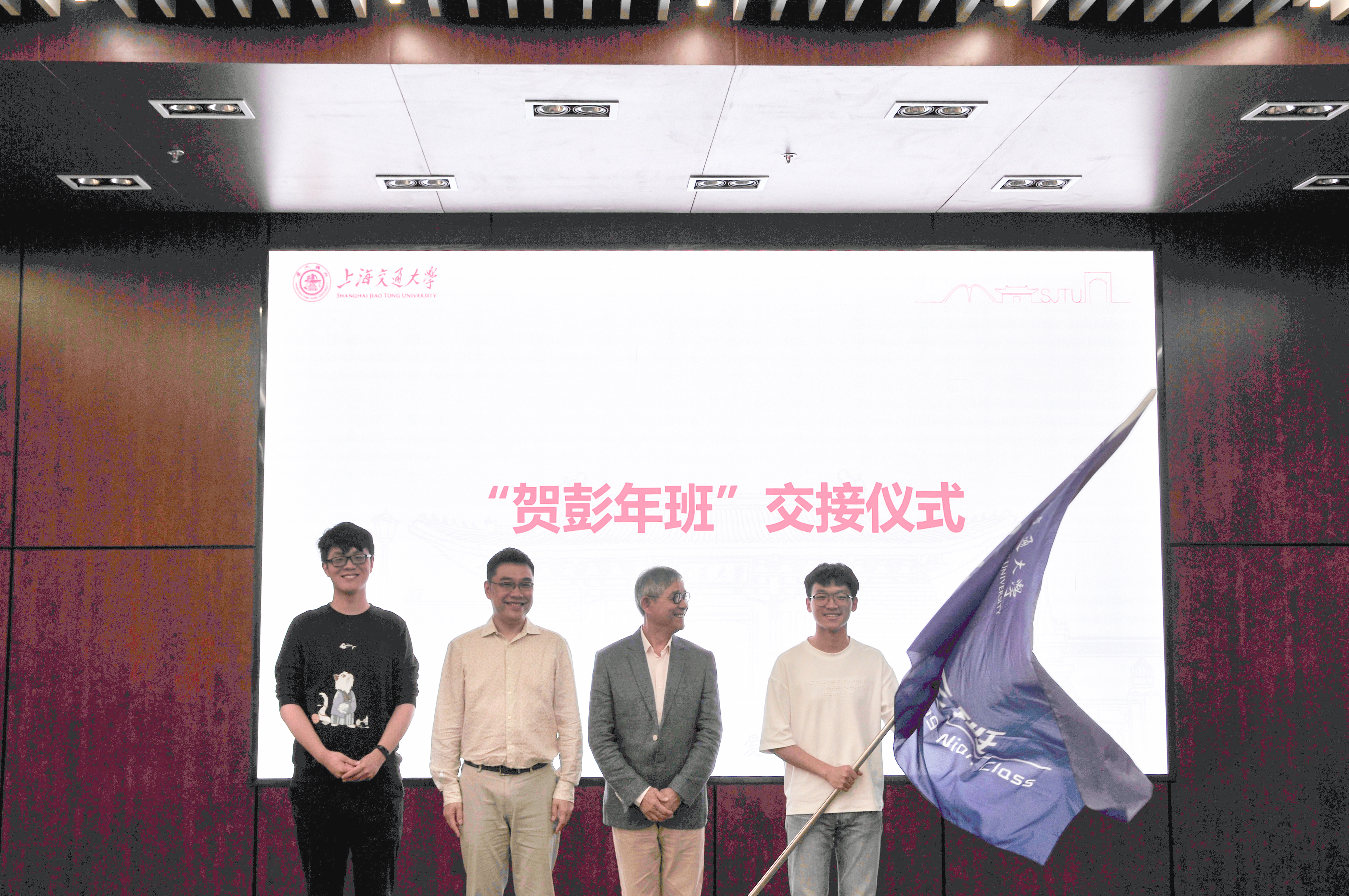 贺平、贺庆共同将代表“贺彭年班”的班级旗帜从F1702114班交接到F2002017班手中,旗帜的交接代表着贺学长精神的传承。