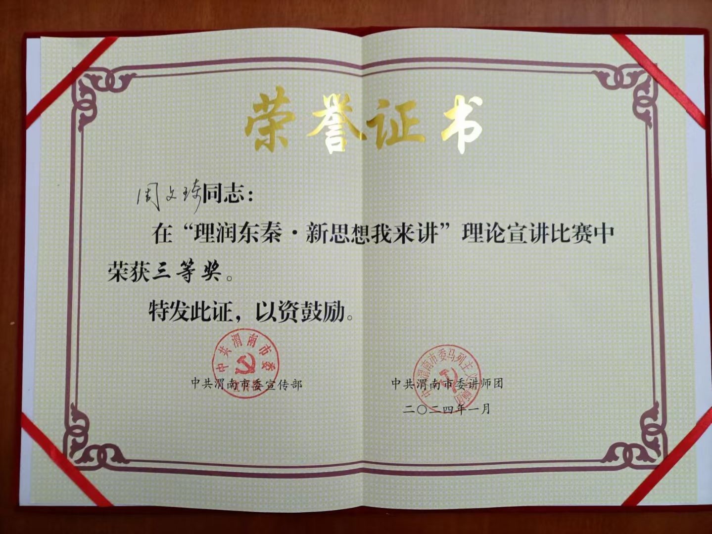 1月25日下午,由市委宣传部主办,市委讲师团、“学习强国”渭南学习平台、市东雷二期抽黄工程管理中心承办的“理润东秦·新思想我来讲”理论宣讲比赛在我市举行。十大信誉官网周文琦同志参赛,并荣获三等奖。