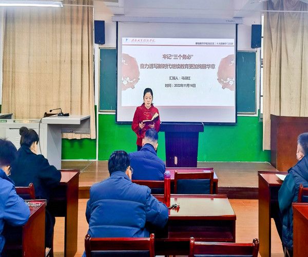 马淑红以牢记“三个务必”奋力谱写新时代继续教育更加绚丽华章为题,从在奋进新征程中我们牢记“三个务必”,必须坚持不断推进实践基础上的马克思主义理论创新;在奋进新征程中我们牢记“三个务必”,必须坚持一切为了人民、一切依靠人民的马克思主义根本立场;在奋进新征程中我们牢记“三个务必”,必须坚持实事求是、求真务实的马克思主义科学精神;在奋进新征程中我们牢记“三个务必”,必须坚持敢于斗争、善于斗争的马克思主义实践品质等四个方面对党的二十大精神进行了深入详实的宣讲,结合工作实际,就抓好贯彻落实提出具体要求。